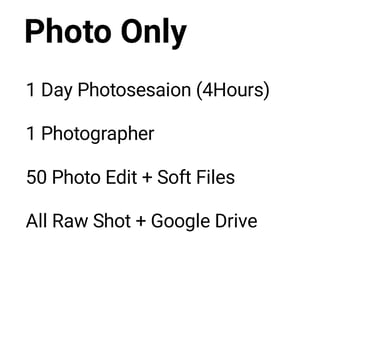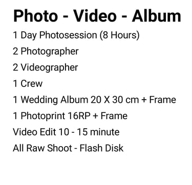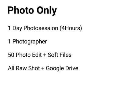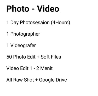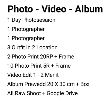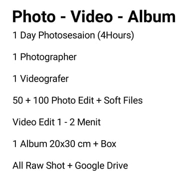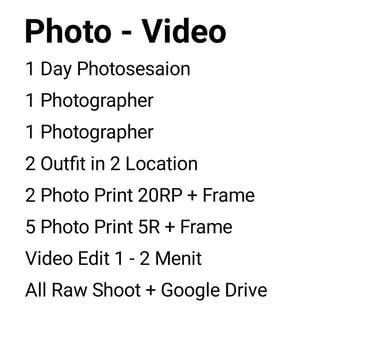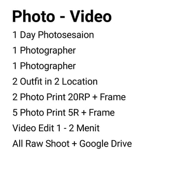 Harga yang tertera belum termasuk biaya transportasi. Biaya transportasi akan disesuaikan dengan lokasi pemotretan dan diinformasikan sebelum hari pelaksanaan.